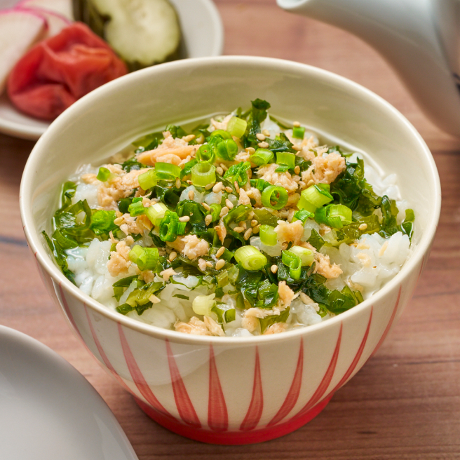 お茶漬けには、株式会社及新で厳選した三陸産わかめを贅沢に使用しています。リアス式海岸で荒波に揉まれた三陸産わかめはシャキッとした食感が特徴で食べた瞬間に磯の香りが口の中に広がります。美味しいだけでなく栄養価も高いことに定評があります。厳選したわかめは葉と茎の両方を使用することで、お茶漬けでもわかめの食感と肉厚さを最大限に楽しめるように工夫しています。